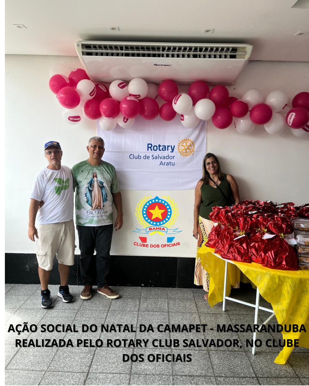 No domingo ensolarado, 14 de dezembro, o Rotary Club Salvador realizou uma ação social alusiva ao Natal da CAMAPET – Massaranduba, realizada nas instalações deste Clube. O evento contou com a apresentação de um palhaço, a presença do Papai Noel, brinquedos infláveis, além da distribuição de lanches e brinquedos para as crianças da comunidade.