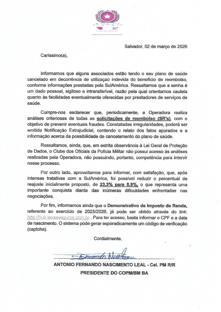 Informativo de reajuste do Benefício SulAmérica